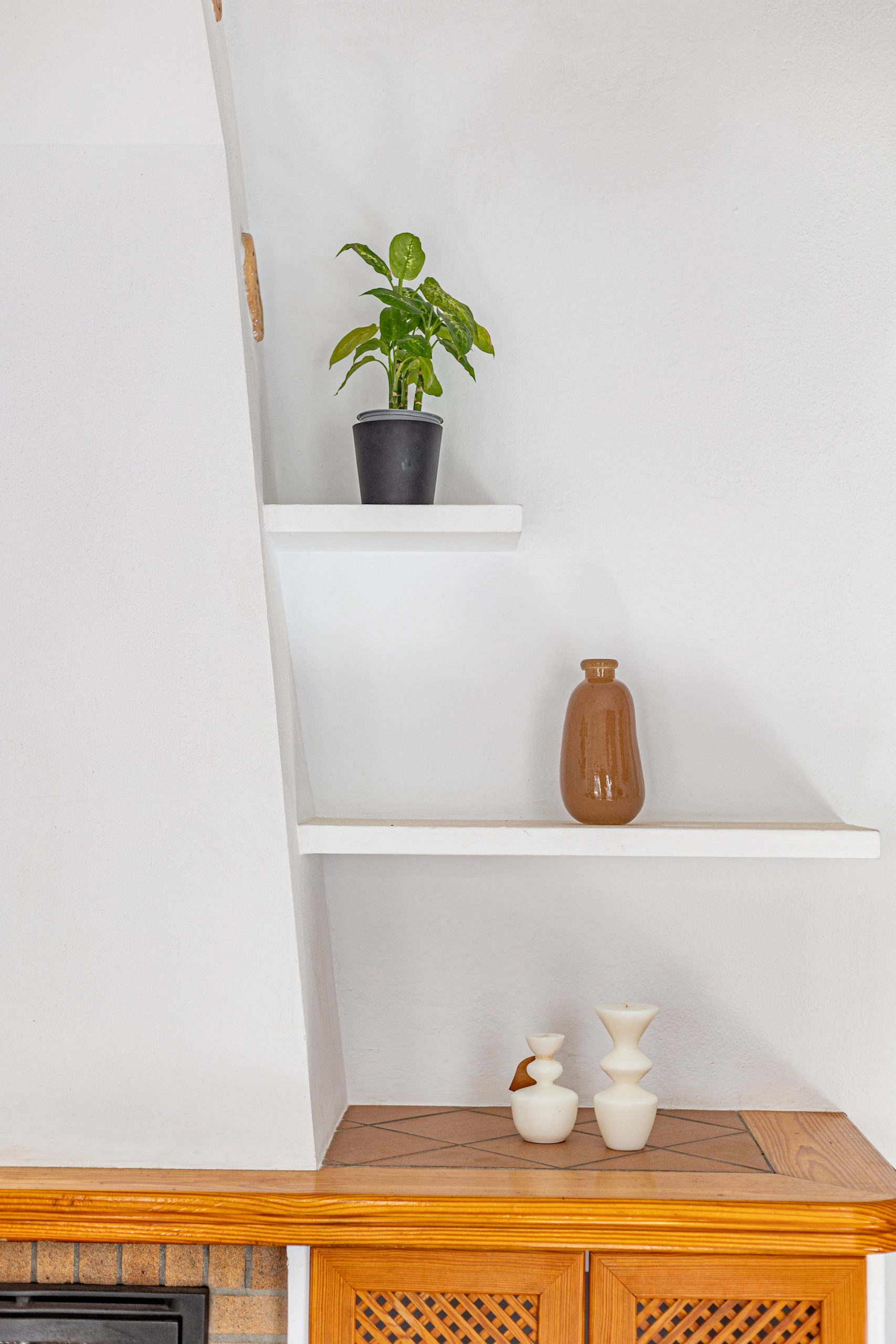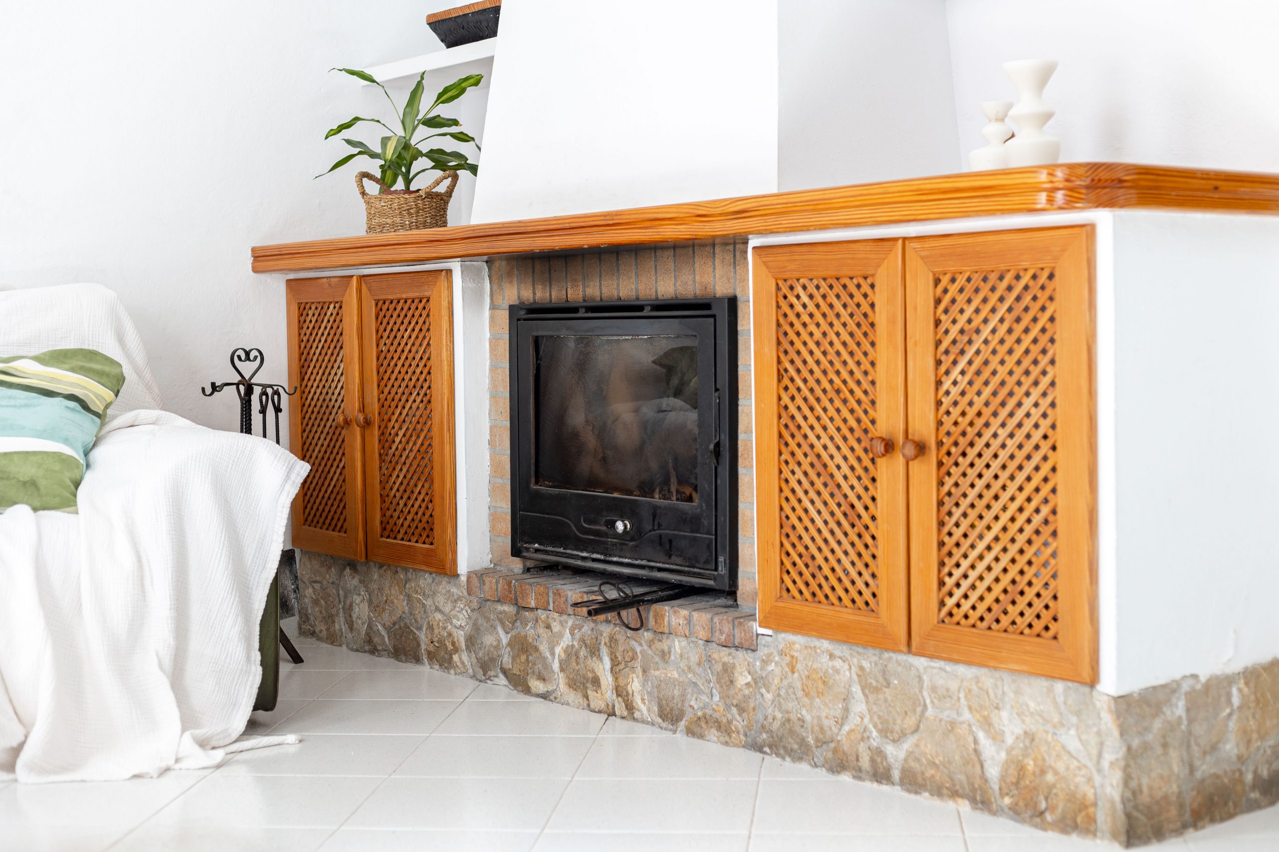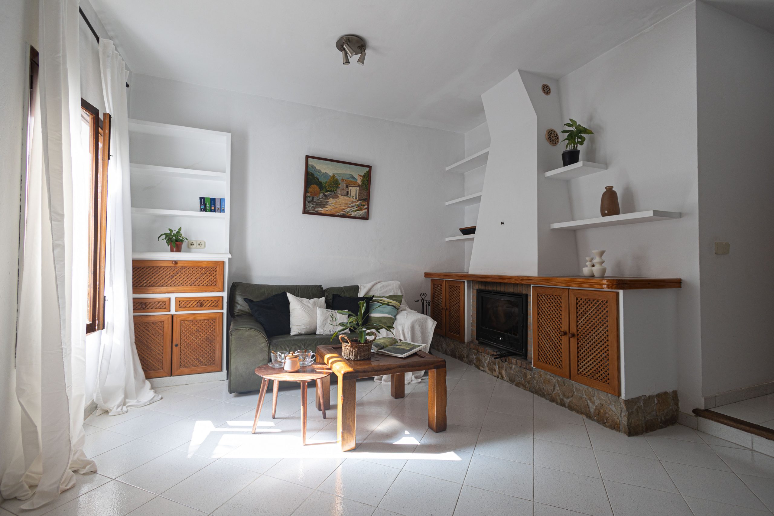 Al entrar al salón, encontrarás una preciosa chimenea a leña, con mueble y estantes a medida. A su derecha, el espacio ideal para comedor se une al espacio de la cocina, que cuenta con puerta corredera para mantener la privacidad y comodidad. Aunque se podría quitar fácilmente si deseas ampliar la cocina e integrarla al comedor.