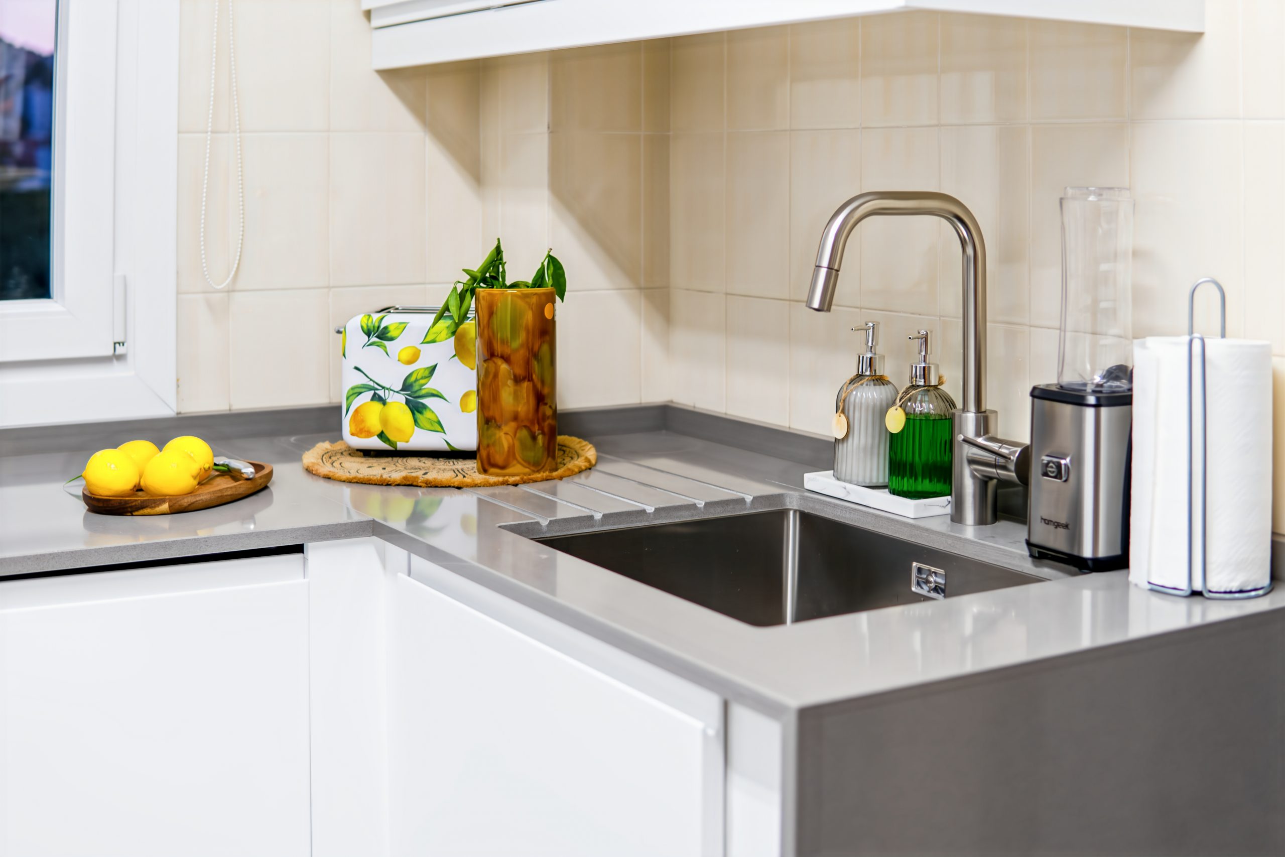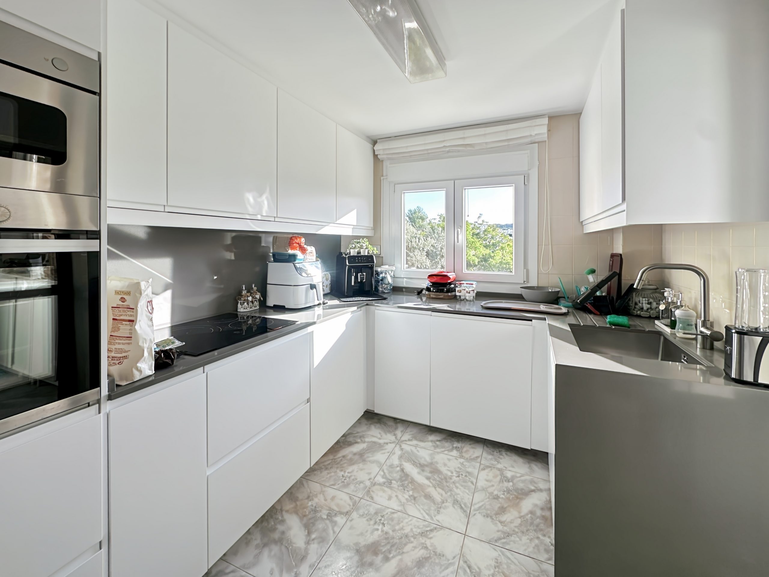 La cocina reformada, equipada con electrodomésticos nuevos como nevera, horno y vitrocerámica, cuenta con un práctico espacio de lavandería que también puede utilizarse como despensa, ofreciendo una funcionalidad excepcional para el día a día.