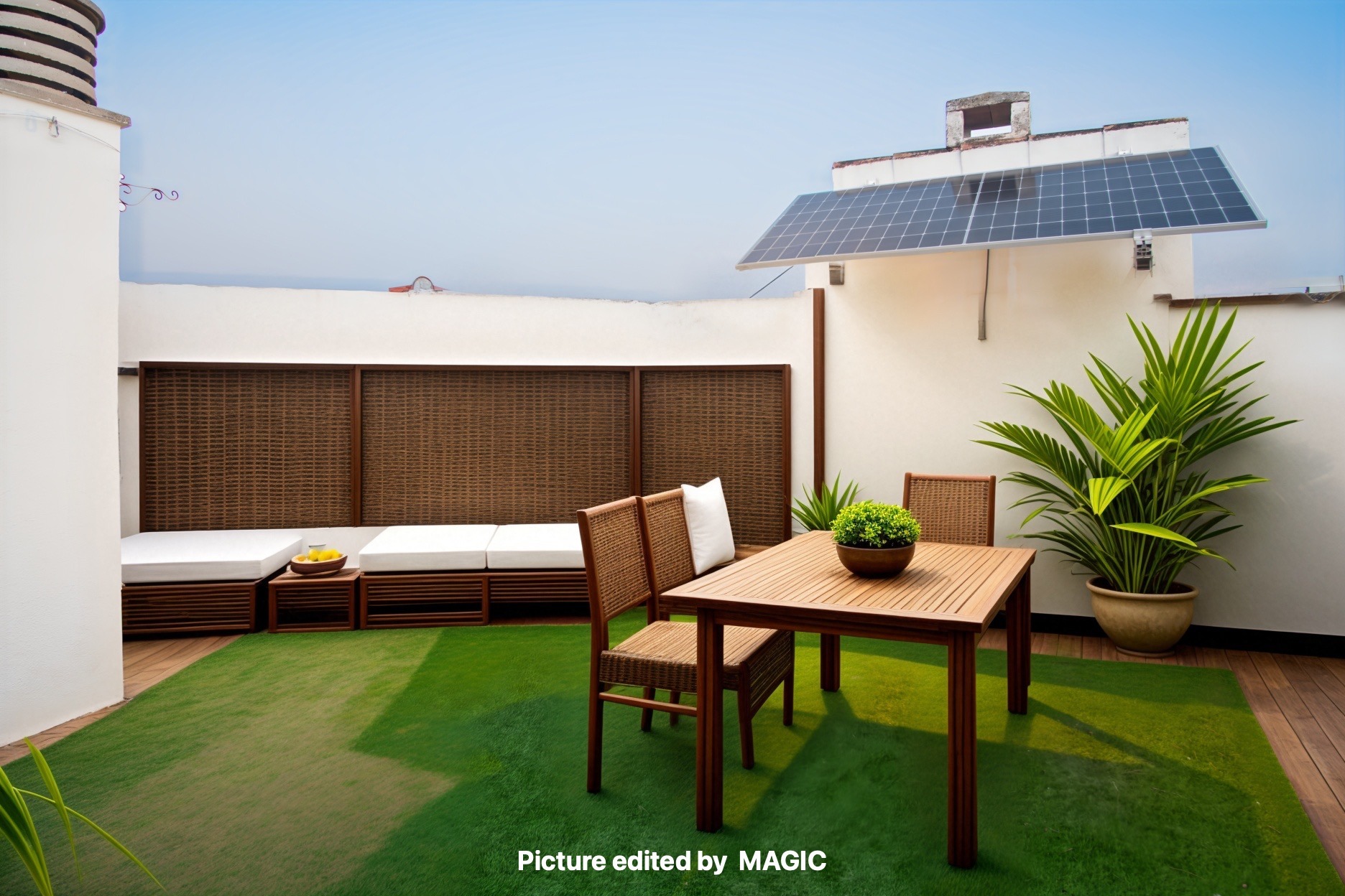 Una terraza exterior de 38 m² con vistas impresionantes, equipada con paneles solares para un hogar sostenible, donde disfrutarás de atardeceres únicos.